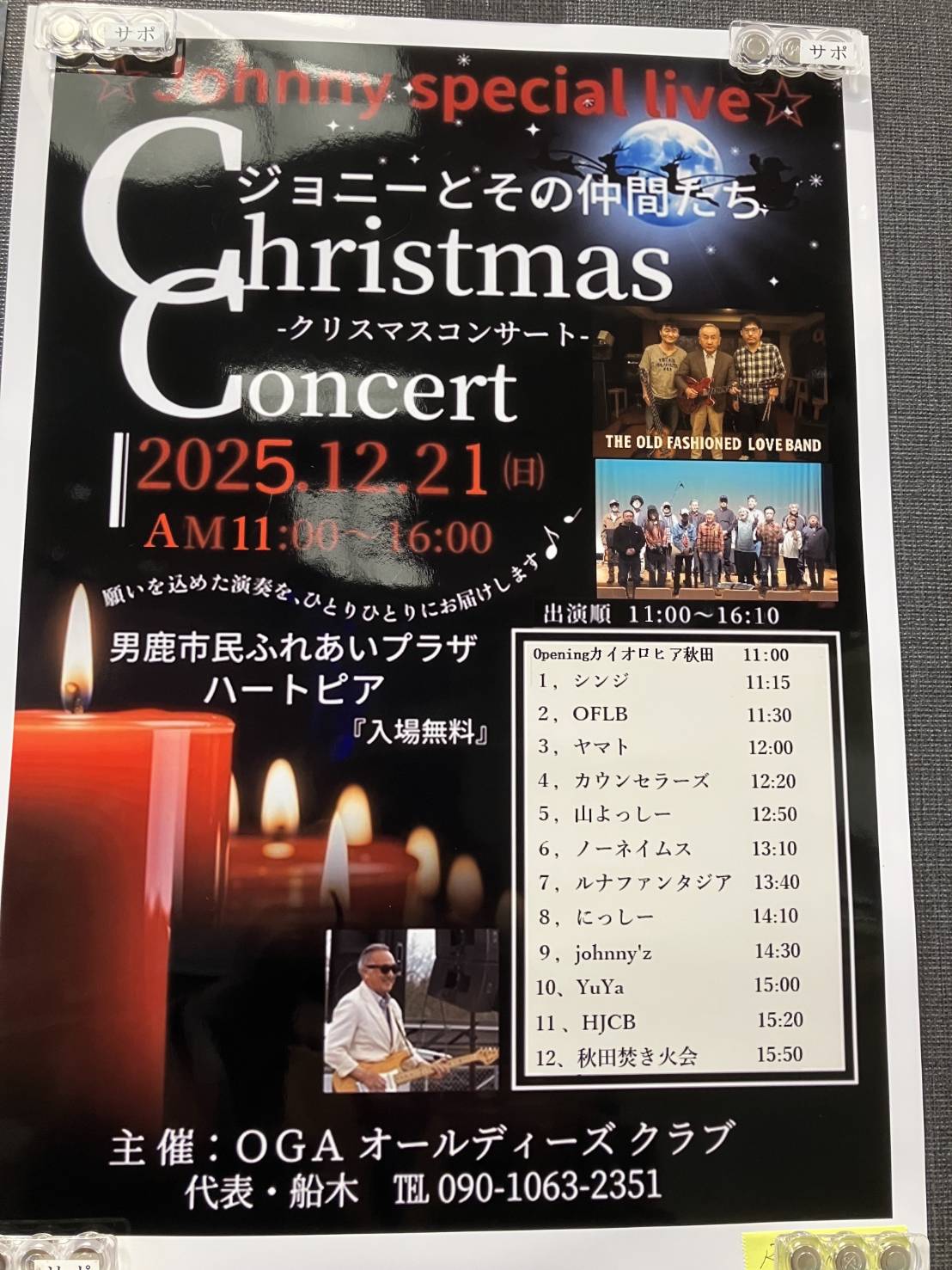 ◆2025年12月21日(日)男鹿市民ふれあいプラザハートピアにて12時20分~ライブをおこないます。