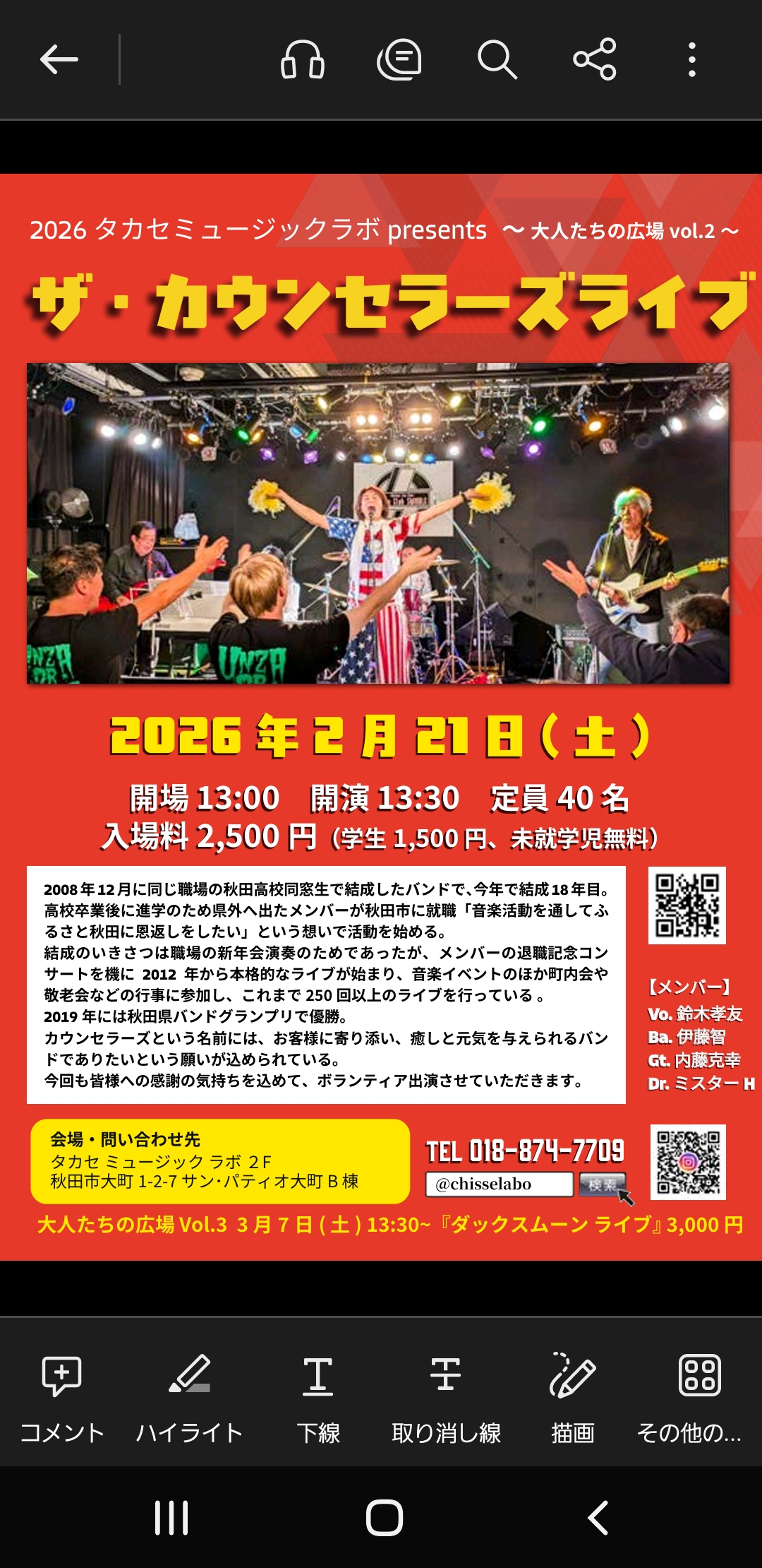 2026年2月21日(土)13時半~タカセミュージックラボ主催のワンマンライブをおこないます。結成18年目のザ・カウンセラーズ。よろしくお願いいたします。